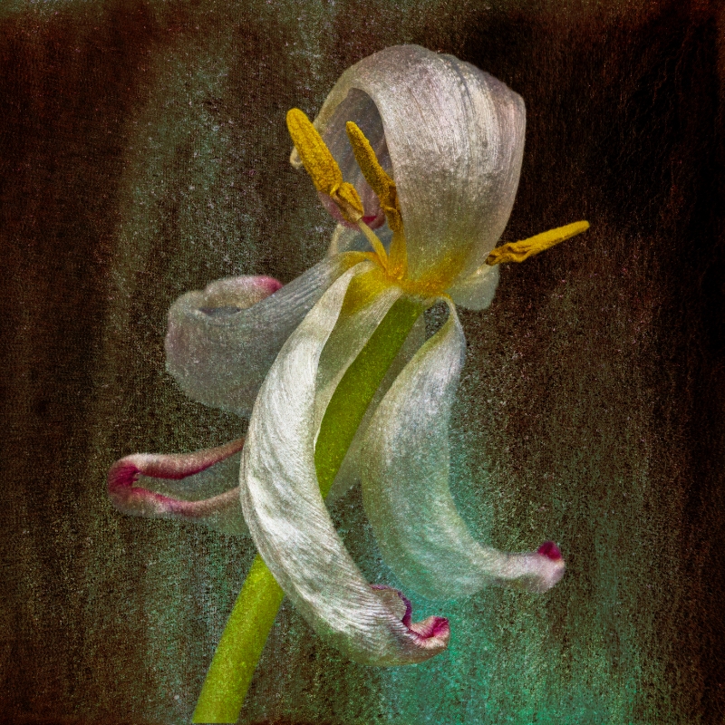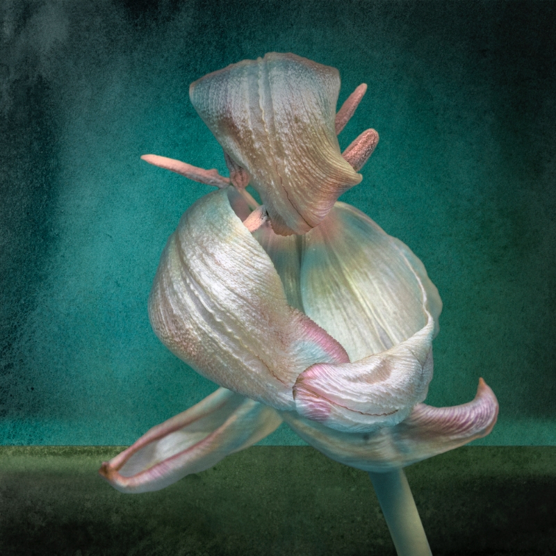 Nynke en Rob houden allebei van bloemen. Rob heeft ontelbare foto’s van bloemen in diverse stadia, van vers tot verschrompeld. Met name de verlepte hebben onvoorspelbare kronkelvormen die doen denken aan dansers. Op een achtergrond van Nynkes aquarellandschappen ontstaat er een dynamisch, maar ook surrealistisch beeld.